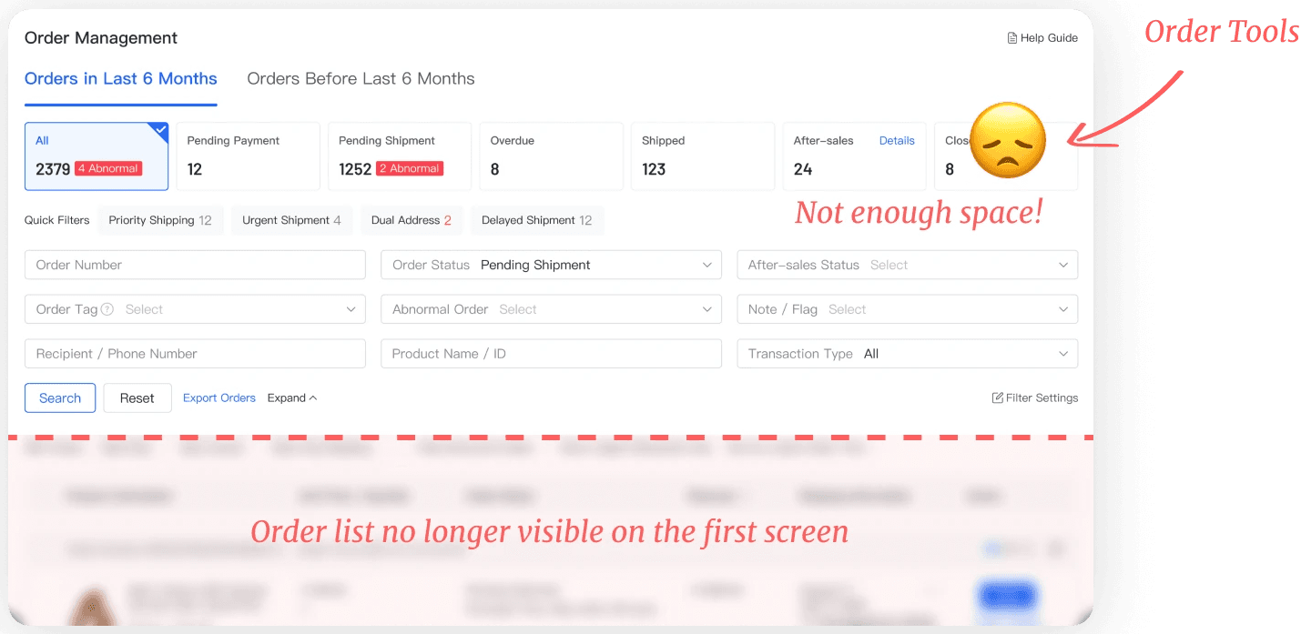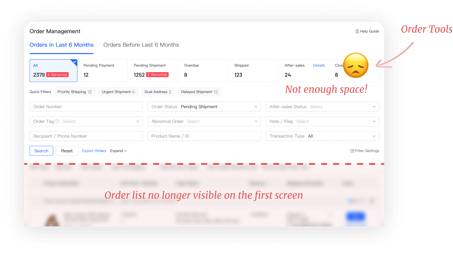 I restructured the filtering area to reduce vertical space usage, improving screen efficiency to accommodate the integration of Order Tools
