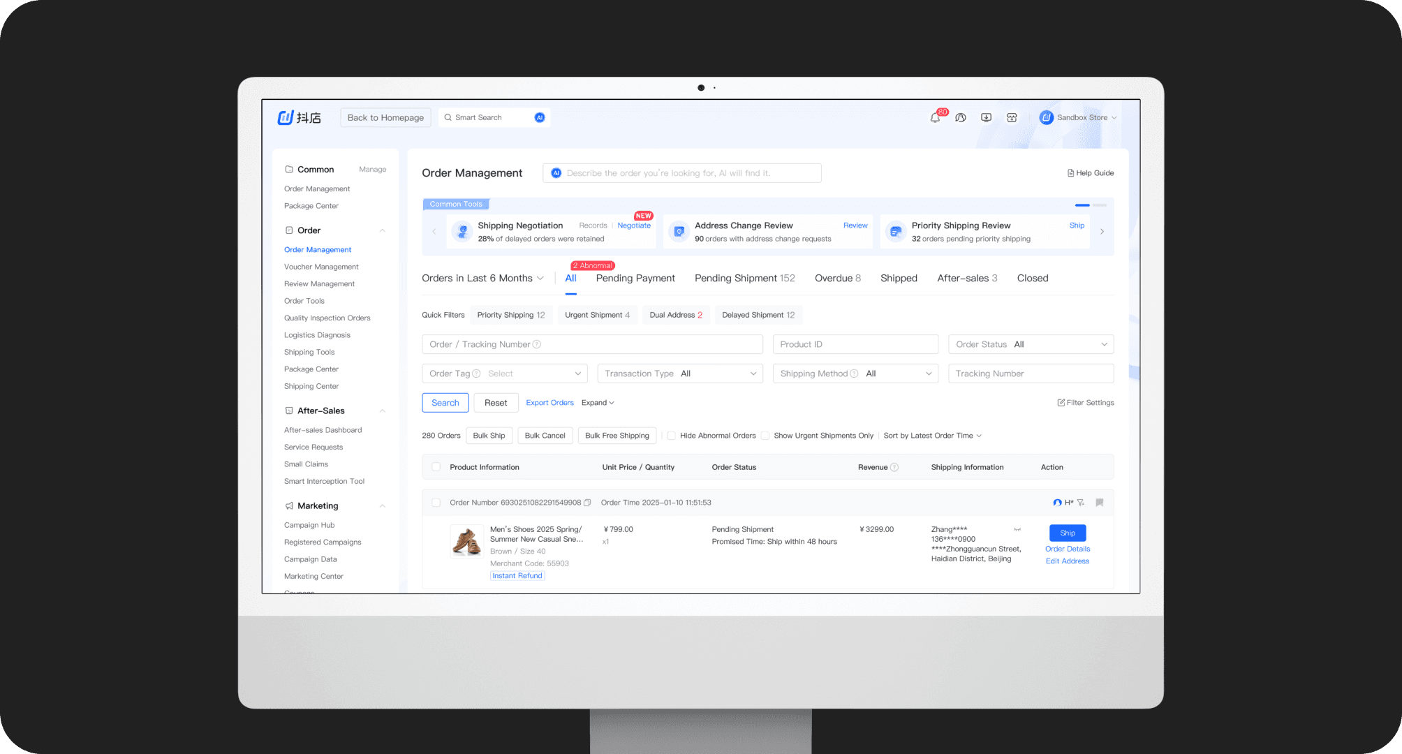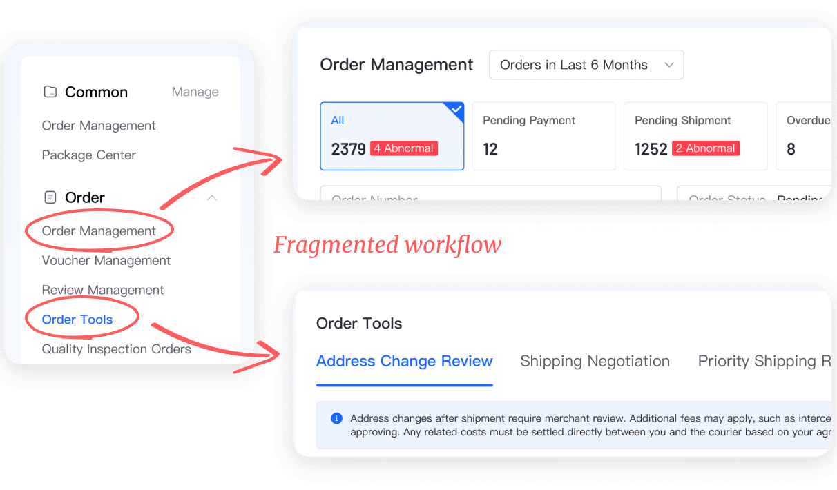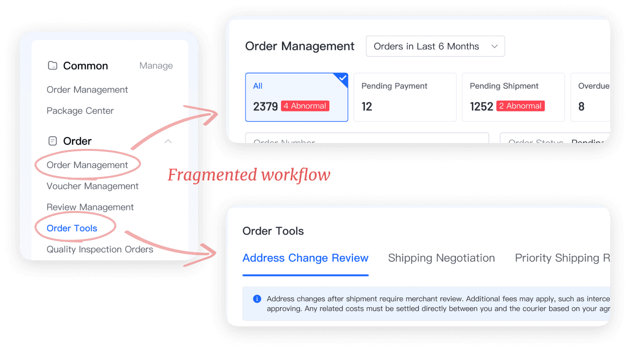 Douyin E-commerce merchants process thousands of orders every day in Order Management. But when exceptions arise, such as address changes or shipping negotiations, they rely on a separate module, Order Tools, to handle these cases